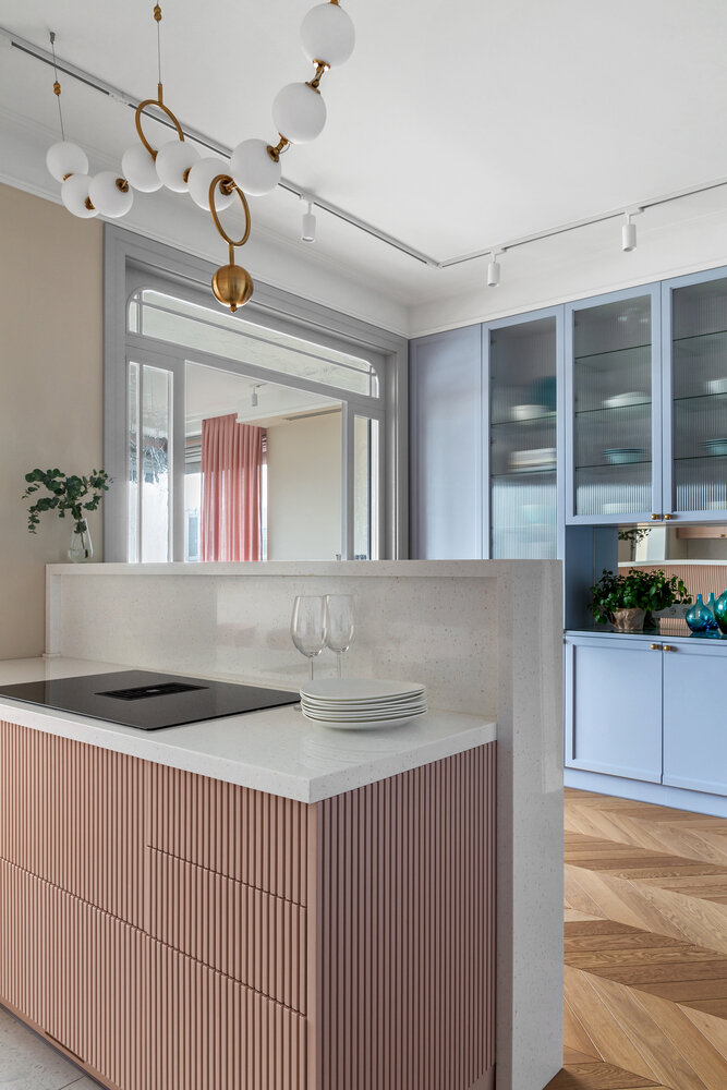 Ящики в острове на немецких доводчиках, с открыванием от нажатия. Фасады на острове рельефные с имитацией реек. Из техники есть индукционная варочная поверхность со встроенной вытяжкой и шкаф для подогрева посуды.