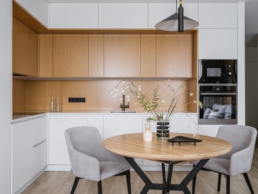 Кухня изготавливалась на заказ в столярной мастерской. Столешница выполнена из акрилового камня.