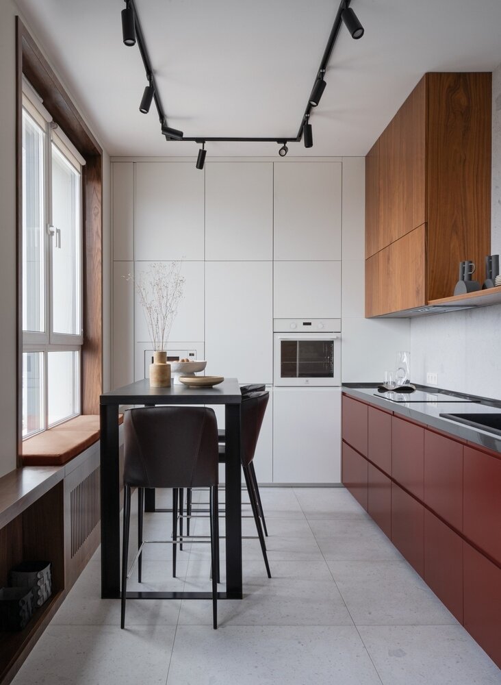 «Почти всю мебель в наших проектах мы делаем на заказ. На кухне использовали закрытое хранение. Одна из стен полностью отдана под шкаф от пола и до потолка. Но было решено оставить одну полку открытого хранения, что добавило легкости и геометрии», — рассказывают дизайнеры.