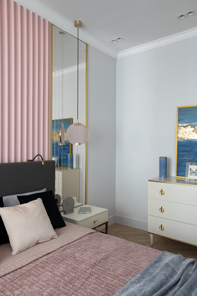 Большая часть корпусной и мягкой мебели делалась под заказ на российских производствах. Для мастер-спальни отдельно заказывали красивые ручки для тумб и стола.