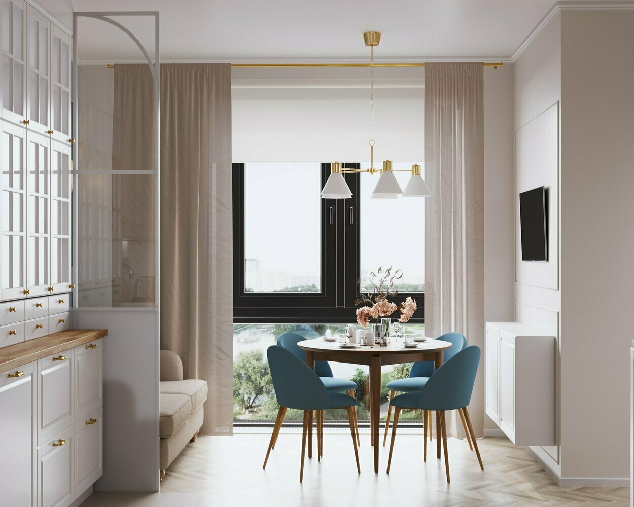 Обеденную зону отделили легкой перегородкой с раскладкой в виде арки. Это своеобразное напоминание о путешествиях, которые любят заказчики.