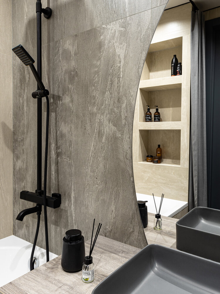 Использовали большеформатный керамогранит 120×60 см российского производства Idalgo.