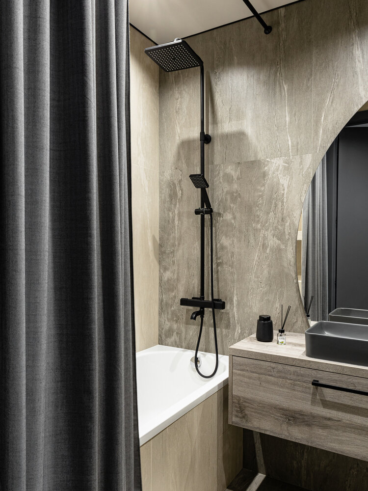 Решили не ставить шторку из стекла, а сделать из специальной ткани. Смотрится очень элегантно.