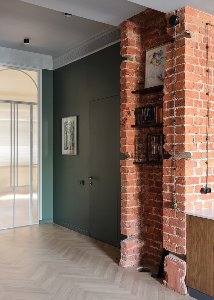 Ниша в кирпиче между кухней и прихожей осталась от предыдущих владельцев. Увы, они не пожалели несущую стену и устроили там вентиляцию. С незаконной вентиляцией расстались, нишу укрепили и устроили полки для книг, картин и декора.