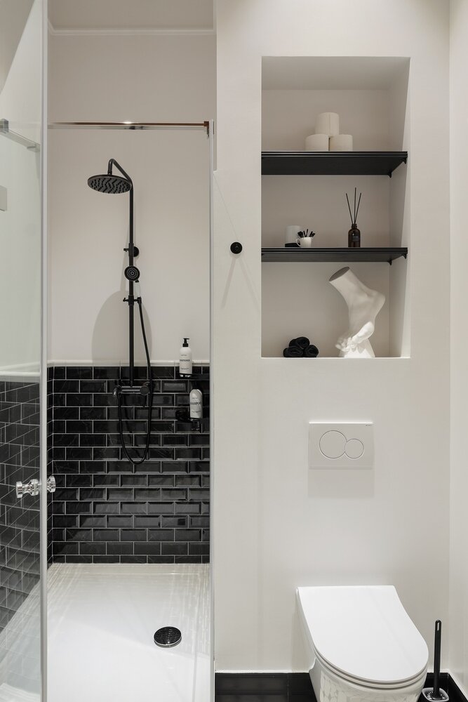 «Над инсталляцией организована ниша, на которую должны были повесить дверцы ИКЕА. В конце ремонта дверцы было уже не купить, поэтому я решила сделать ее наполовину декоративной», — рассказывает дизайнер.