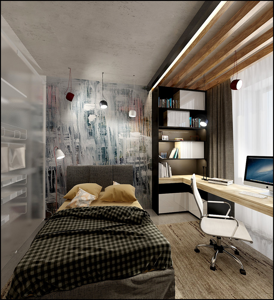 Фотография:  в стиле , Спальня, Кабинет, Лофт, Декор интерьера, Квартира, Планировки, Декор, Мебель и свет, Проект недели, Зеленый, Серый, Коричневый, комната студента, как обустроить комнату для студента, спальня в стиле лофт – фото на INMYROOM
