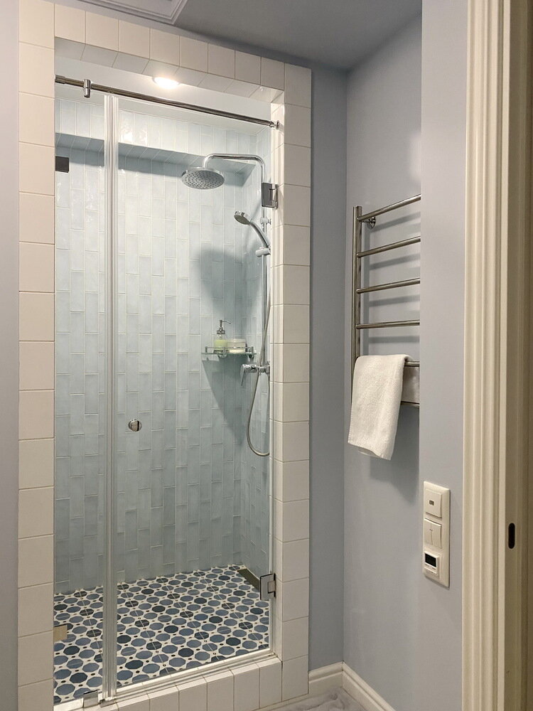 В санузле плитку использовали только в «мокрых зонах» — в душевой и у раковины.