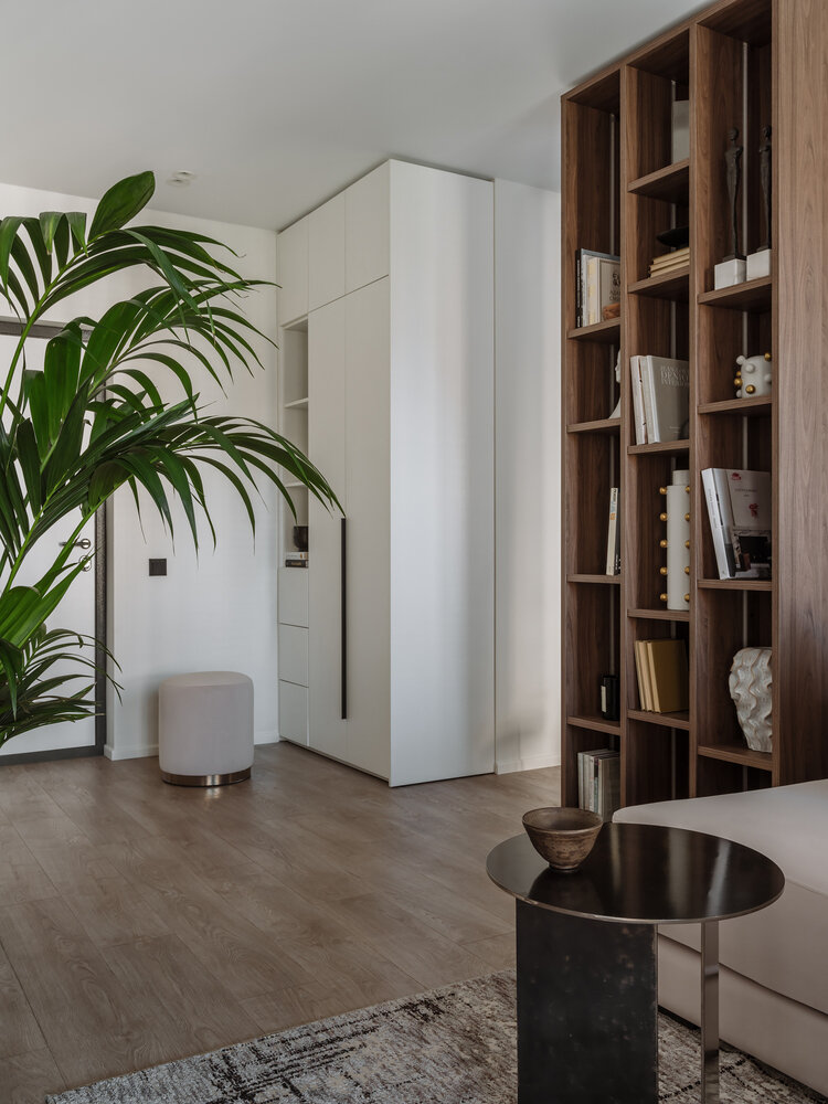 В квартире продуманы системы хранения: в прихожей на заказ сделан шкаф для верхней одежды. Для основного хранения в спальне выделена вместительная гардеробная, шкафы собраны из готовых модулей, тут удалось сэкономить.