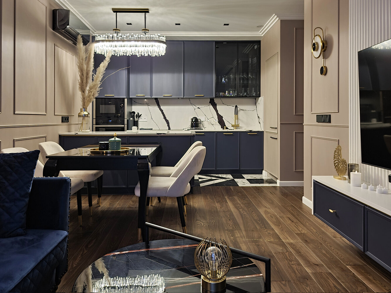 Есть посудомоечная машина, фильтр для воды, измельчитель отходов, большой встроенный холодильник, духовой шкаф, микроволновая печь, чайник. Блендер и разная мелкая утварь помещаются в верхних полках.