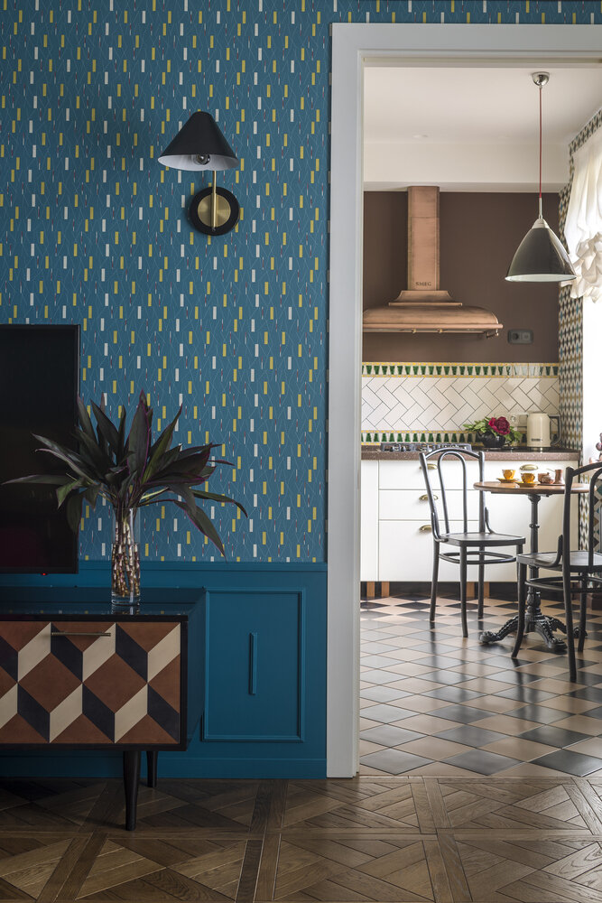 На кухне паркет сменяется плиткой в шахматной раскладке с деталями оттенка кофе с молоком.