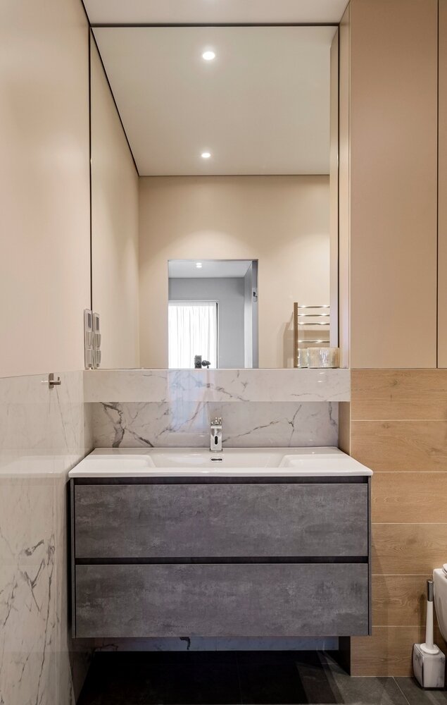 Около раковины никогда не хватает места, его всегда мало. Поэтому реализовано решение с полочкой в строительном исполнении, она незаметна и функциональна. Над унитазом расположился вместительный шкафчик для всего необходимого в ванной комнате. Шкафчик сделан на заказ.