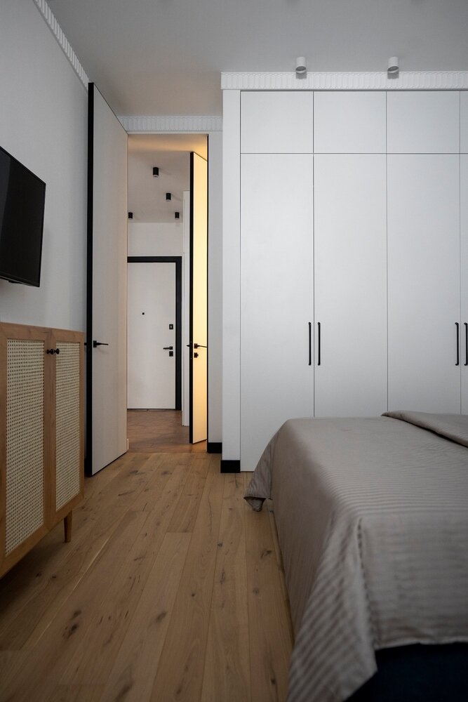 В качестве систем хранения были сделаны шкафы, максимально продуманные, до потолка. Двери выполнены в пол, цоколь шкафов скрыт за ними — так они смотрятся более лаконично.