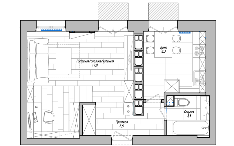 Фотография: Планировки в стиле , Гостиная, Спальня, Кабинет, Скандинавский, Малогабаритная квартира, Квартира, Estiluz, LAUFEN, SIEMENS, Мебель и свет, Белый, Минимализм, Перепланировка, Бежевый, Желтый, Серый, Коричневый, Ideal Lux, Hansgrohe, Беларусь, Минск, Basis, A.S.CREATION, Caparol, UPOFLOOR, Ceracasa CERAMICA, Duravit, Lafaenza, Eurocube, Евгения Лыкасова – фото на INMYROOM