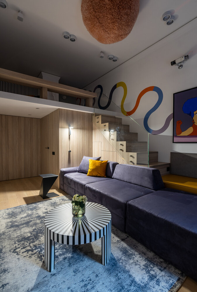 Двухэтажная гостиная с хранением под лестницейДизайн