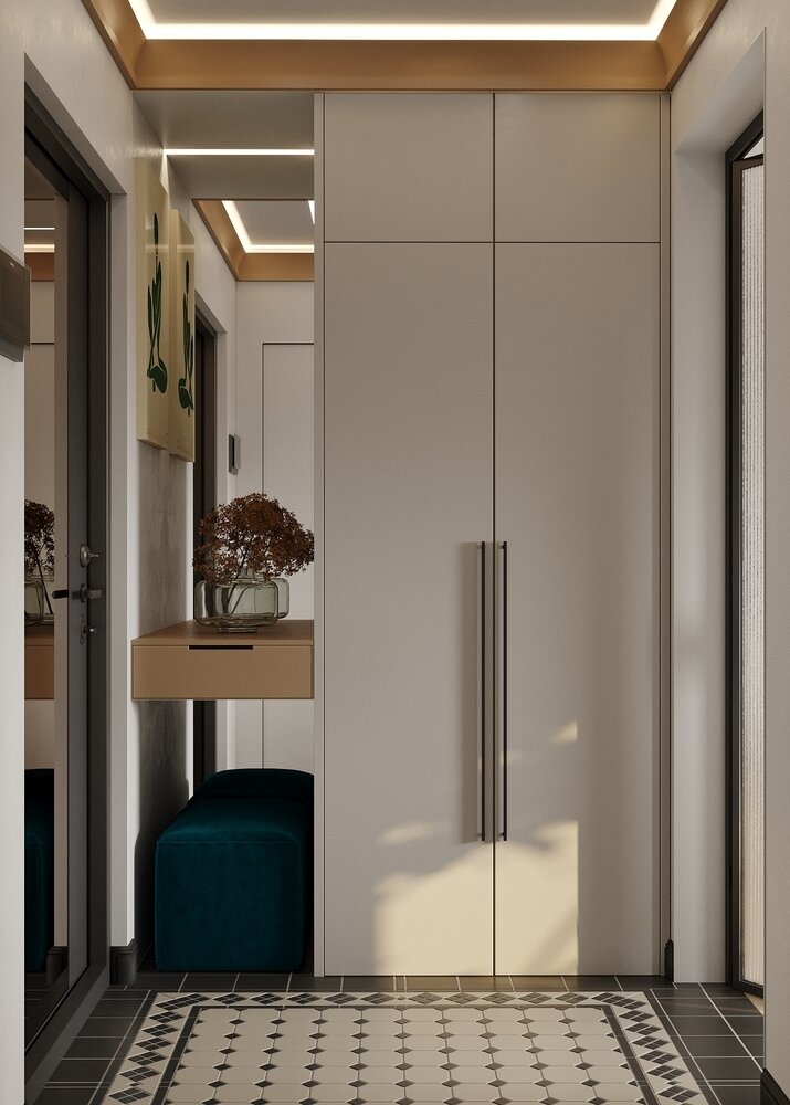 «Картина в зоне прихожей расположена не просто так. Заказчики не захотели переносить электрощитовую от застройщика, и мы ее задекорировали этой картиной», — рассказывает дизайнер.