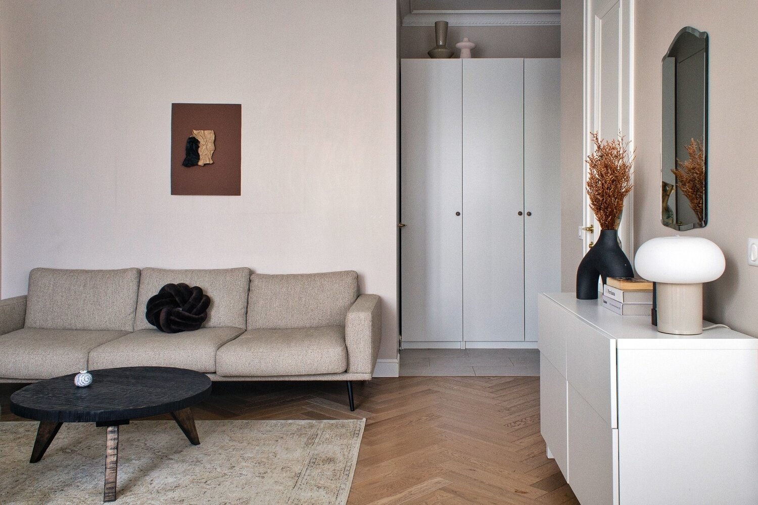 Обеденный и журнальный столики в гостиной из состаренного дерева делали на заказ, это ручная работа. В гостиной над диваном по проекту планировали повесить две картины, но долго ничего не могли подобрать. «Я предложила повесить что-то временное, пока мы не найдем подходящие картины. И сделала инсталляцию из бумаги, в итоге она вписалась в интерьер и пока так и висит», — говорит дизайнер.