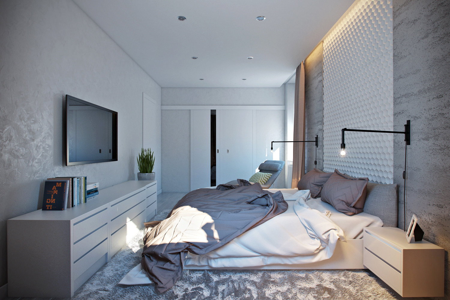 Фотография: Спальня в стиле Лофт, Современный, Гардеробная, Квартира, Россия, Белый, Минимализм, Проект недели, Москва, Зеленый, Бежевый, Серый, Коричневый, Олеся Лигай – фото на INMYROOM