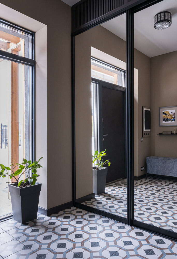 Система шкафов в спальне, шкаф для одежды в прихожей — это единственные места хранения. За зеркальными фасадами дверей-купе скрыт хозяйственный отсек с системами жизнеобеспечения дома (газовый и резервный котлы, системы очистки).