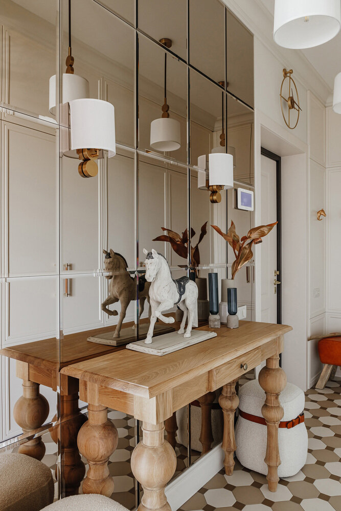 Практически все системы хранения — это встраиваемые шкафы. Идея была в том, чтобы их не выделять, а сделать частью стен, поэтому фасады имитируют панели. В прихожей фасады сделаны до пола с небольшим зазором, двери обозначены ручками из кожи и латуни. В гостевой комнате тот же прием, но сами фасады выполнены из дубового шпона с зеркальными вставками.