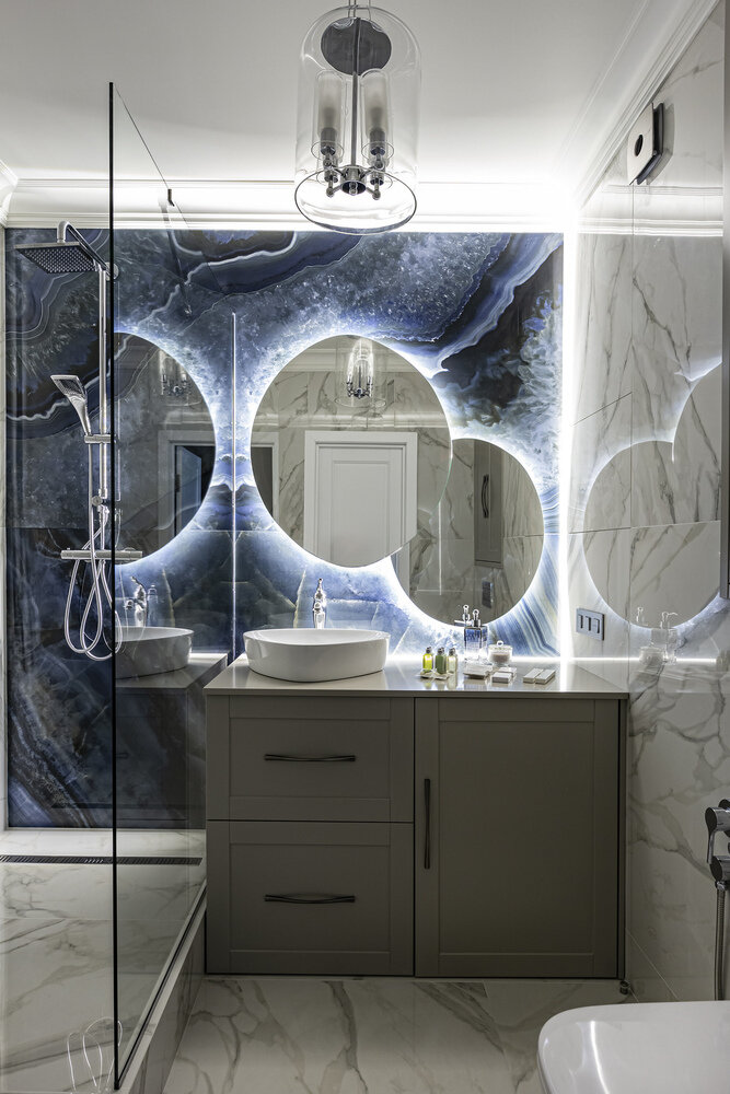 Стиральная машина размещена в ванной и спрятана за мебельным фасадом. Для пылесоса и хозяйственных принадлежностей удалось выделить отдельный хозблок за счет переноса входа в спальню на месте образовавшейся ниши.