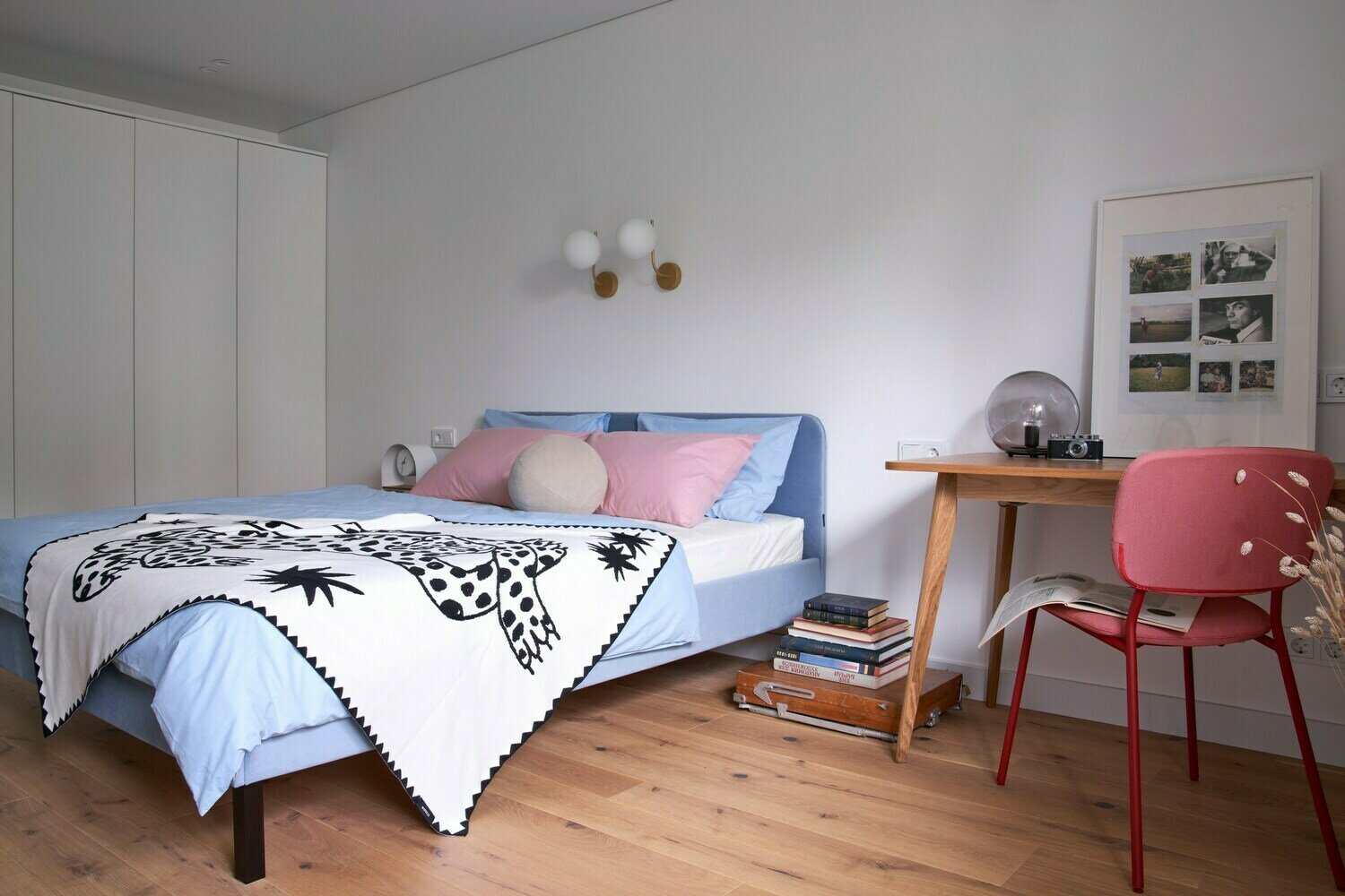 В гостиной для повседневной одежды установлен двухметровый белый шкаф в минималистичном стиле без ручек — так он выглядит визуально незаметным. Для хранения документов и книг — комод напротив кровати. Он же — место для картин и декора.