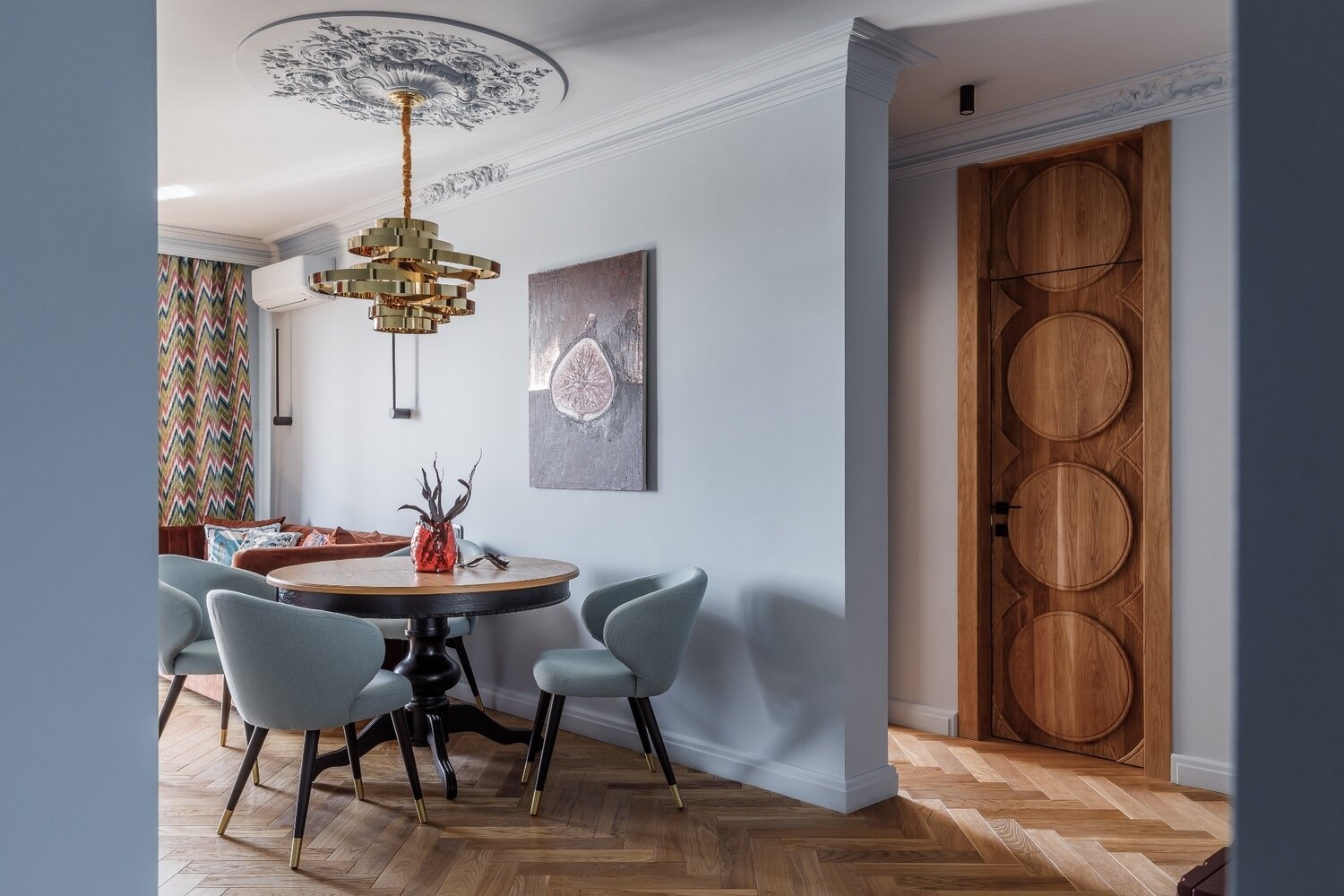 Двери в интерьере сыграли главную роль, завязав окружающее пространство своими нестандартными размерами и геометрическим рисунком на полотне.