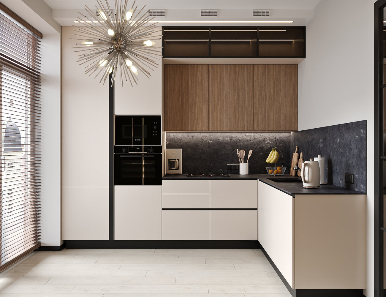Выбрали несколько отделок для фасадов: гладкие матовые фасады белого цвета с контрастными черными деталями плюс верхние шкафы в шпоне. Антресольные шкафы выполнены с фасадами из тонированного стекла с внутренней подсветкой.