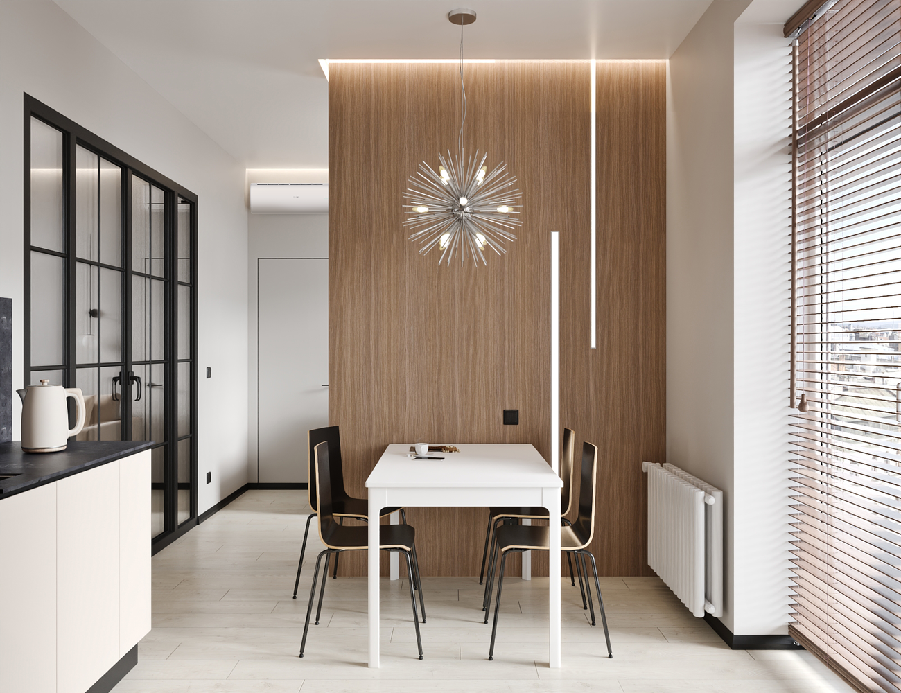 Перегородка между кухней и гостиной облицована керамогранитом под полированный камень с одной стороны и шпонированными панелями с другой.