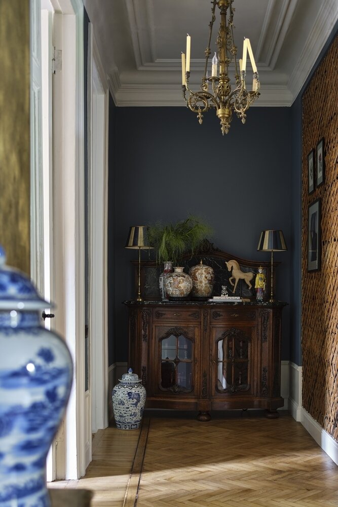 Для организации хранения использовали винтажную мебель, которую для этого проекта нашли в Европе: дубовую голландскую библиотеку, шкафы в стиле шинуазри, французские комоды с маркетри.