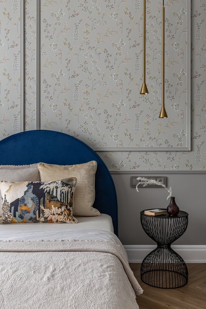 В спальне для декора стены за изголовьем кровати использовали обои с флоральным рисунком, обрамленные молдингами, будто окна в цветочный сад.