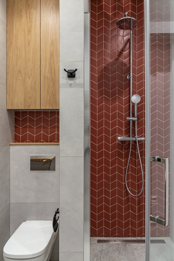 В ванной использовали широкоформатный керамогранит, чтобы визуально расширить небольшое помещение, для акцентов задействовали мелкоформатную керамическую плитку.