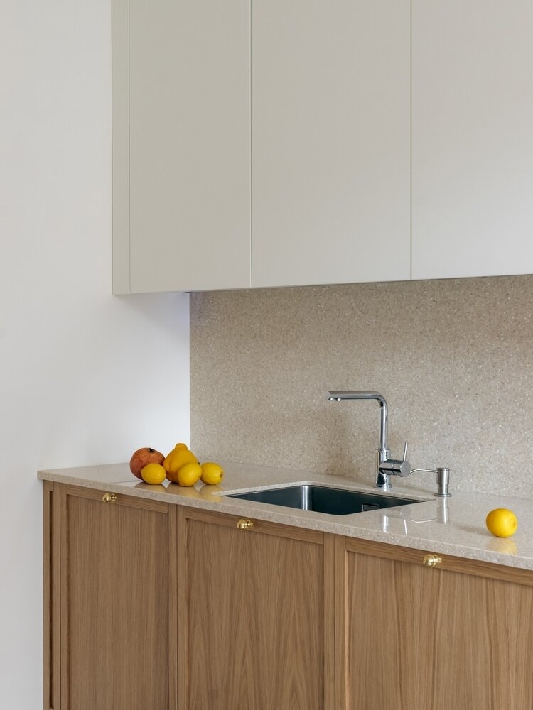 Для столешницы и кухонного фартука использовали искусственный камень, чтобы кухня смотрелась гармонично и лаконично.