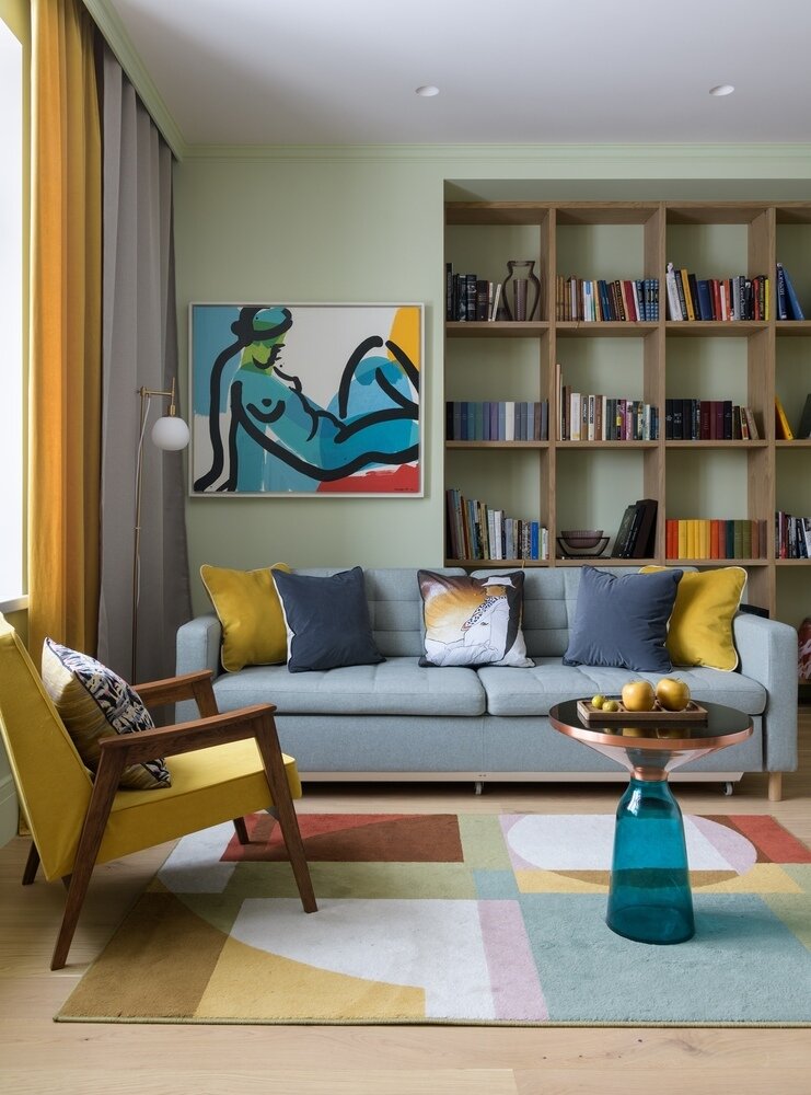 За счет переноса стены между спальней и гостиной получилось сделать нишу, где позже расположили домашнюю библиотеку.