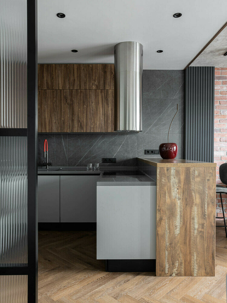 Зона кухни частично отделена стеклянной перегородкой, чтобы обособить вход в санузел. Зона готовки обращена к гостям, а барная стойка удобна для быстрого перекуса.