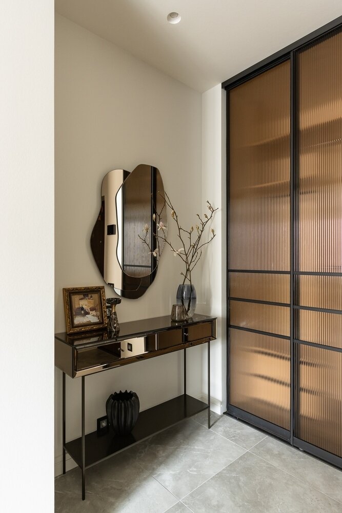 Шикарную консоль в прихожей и очень необычное зеркало из трех частей заказали в La Redoute. Эта зона встречает всех гостей, и в зеркале отражается свет из окна в спальне.
