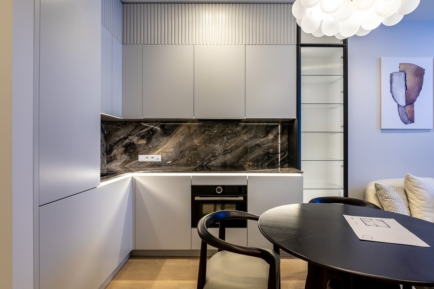 Фасады выполнены в нейтральном сером цвете, без ручек. Для столешницы и фартука выбрали красивый искусственный камень. Визуально он смотрится дорого и благородно.