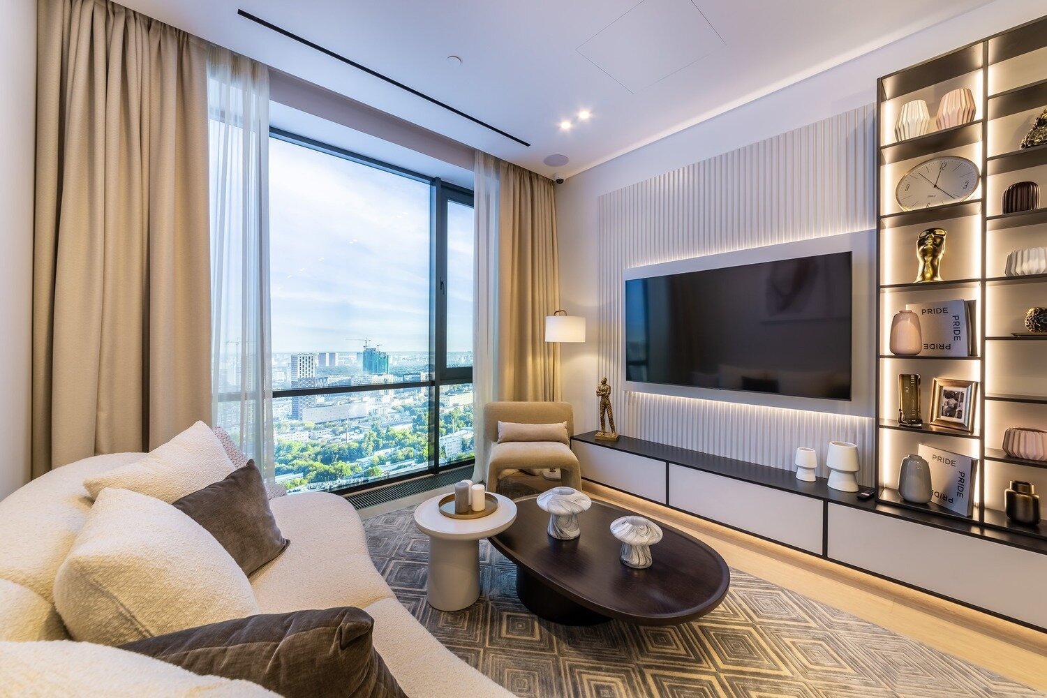 В интерьере продумано несколько вариантов освещения. Помимо основного света, здесь много подсветок для создания приятной расслабляющей атмосферы, а также есть торшер для чтения.