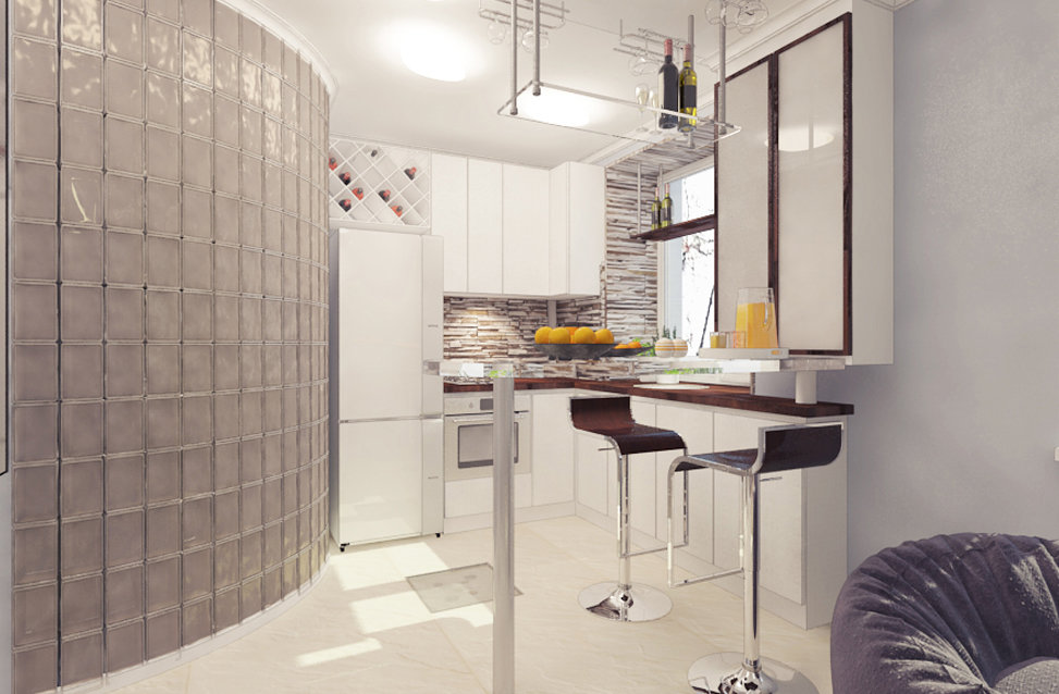 Фотография: Кухня и столовая в стиле Современный, Хай-тек, Квартира, Россия, Vitra, Белый, Проект недели, Бежевый, Dulux, Серый, Коричневый, Эко, ИКЕА, Kerama Marazzi, Новая Москва, Стильные кухни, Aureliano Toso, Vetroarredo, Kermi, Am.Pm, Devon Devon, PremierDecor, Azteca, Kludi Steel, Виктория Качуровская, Александра Бронникова, АрхБрови, ArchBrovi, студия для двоих в экостиле, скругленные углы, стена из стеклоблоков, однушка из двушки, Тушино – фото на INMYROOM