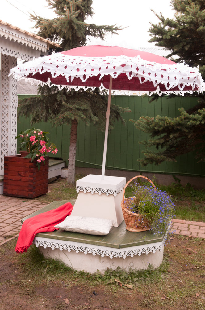 Фотография: Терраса в стиле Прованс и Кантри, Россия, Ландшафт, Декор, Мебель и свет, Белый, Дача, Красный, Зеленый, Бежевый, Коричневый, Эко, Подмосковье, Дом и дача, Фазенда, Трехгорная мануфактура, АртГородец, Можайский лесопильный деревообрабатывающий комбинат, Александр Жданов, Светлана Васильева, деревянный фасад в русском стиле, баня пряничный домик, деревянная кровля, резьба по дереву, городецкая резьба, городецкая роспись, астраханский стиль – фото на INMYROOM