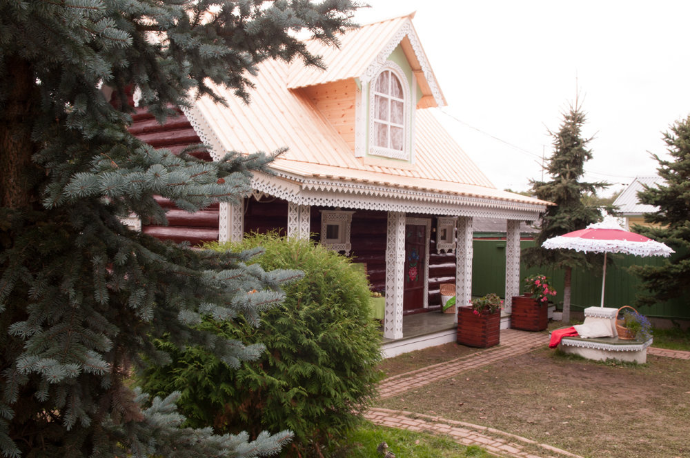 Фотография:  в стиле , Прованс и Кантри, Россия, Ландшафт, Декор, Мебель и свет, Терраса, Белый, Дача, Красный, Зеленый, Бежевый, Коричневый, Эко, Подмосковье, Дом и дача, Фазенда, Трехгорная мануфактура, АртГородец, Можайский лесопильный деревообрабатывающий комбинат, Александр Жданов, Светлана Васильева, деревянный фасад в русском стиле, баня пряничный домик, деревянная кровля, резьба по дереву, городецкая резьба, городецкая роспись, астраханский стиль – фото на INMYROOM