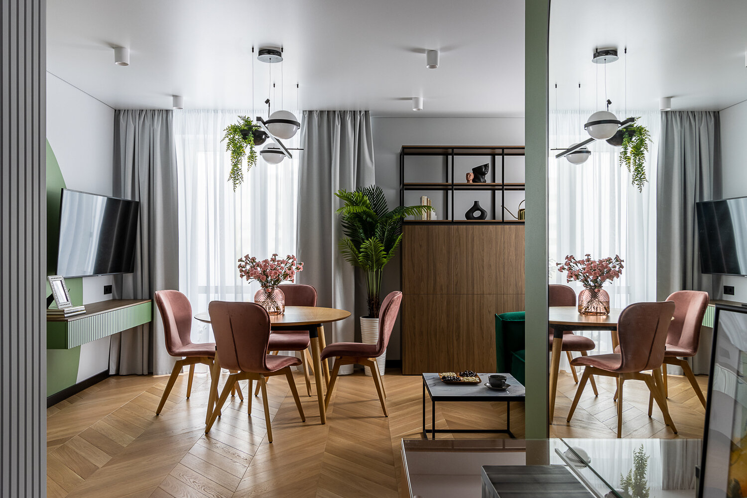 Потолок решили делать натяжной с теневым профилем, матовый, чтобы ускорить процесс стройки. В некоторых местах — спальне и гостиной — использовали 3D-панели. В частности — на двери в постирочную, чтобы визуально ее спрятать и добавить вертикалей пространству.