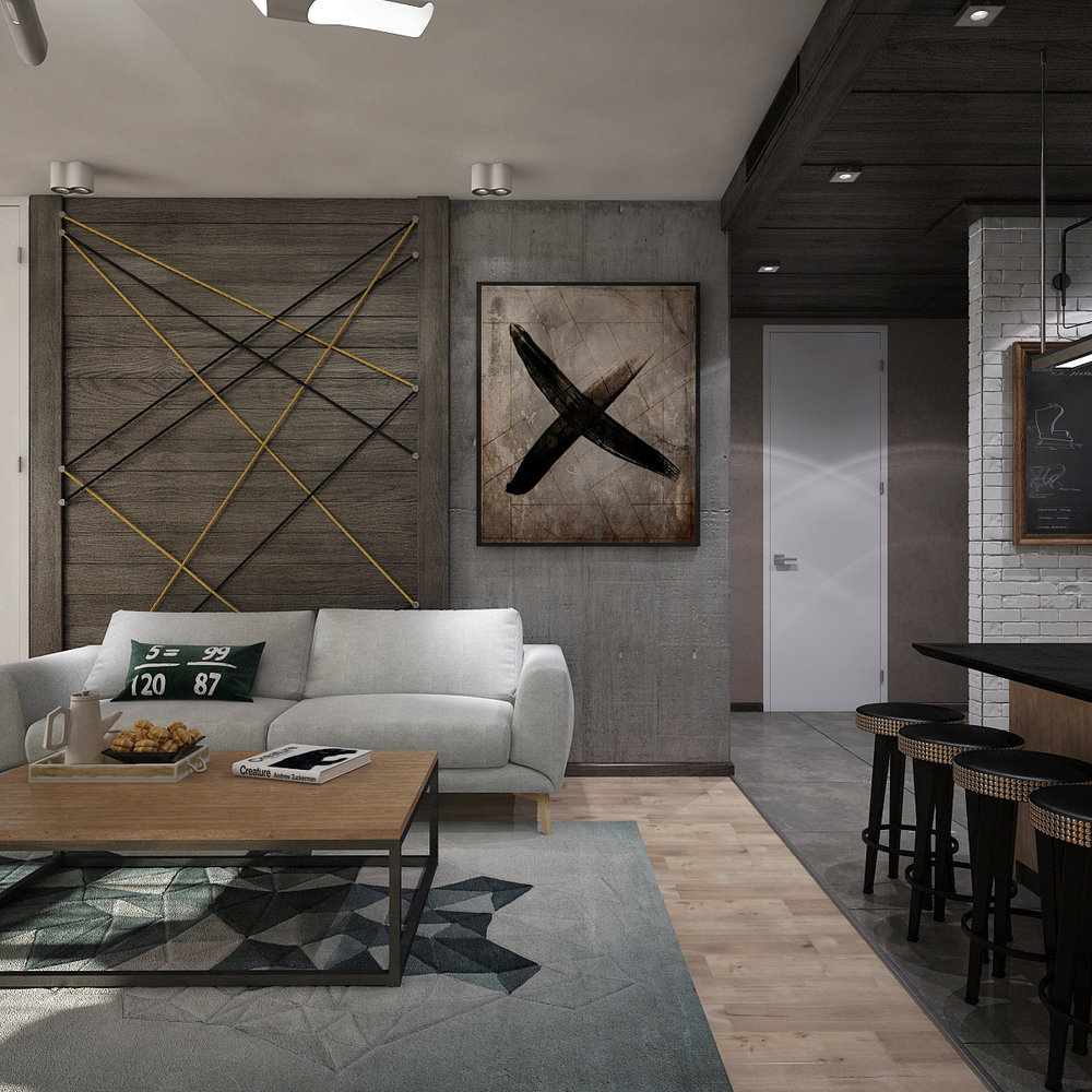 Фотография: Гостиная в стиле Лофт, Кухня и столовая, Квартира, Планировки, BoConcept, Мебель и свет, Минимализм, Проект недели, Черный, Москва, Бежевый, Желтый, Серый, Коричневый, Павел Алексеев, Arenaria, Scavolini, кухня-гостиная с эркером, лофт плюс минимализм, кухня-гостиная со входами в спальни – фото на INMYROOM