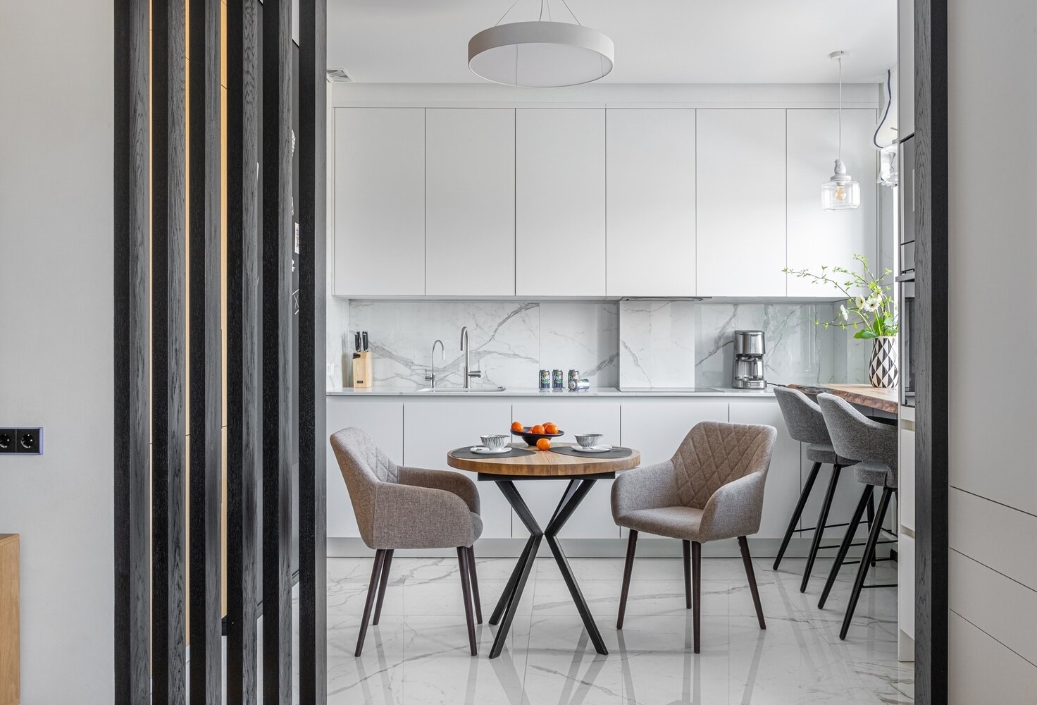 Хозяева не захотели портить визуально вид красивого фартука, поэтому розетки сразу запланировали скрытые выдвижные в столешнице. За счет того, что столешница более широкая, такие розетки не мешают и не уменьшают рабочую поверхность.