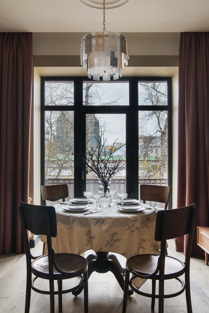 Когда приходят гости, в гостиную переносится обеденный стол из кухни. Его ставят у окна — специально для этого здесь предусмотрели потолочную люстру.
