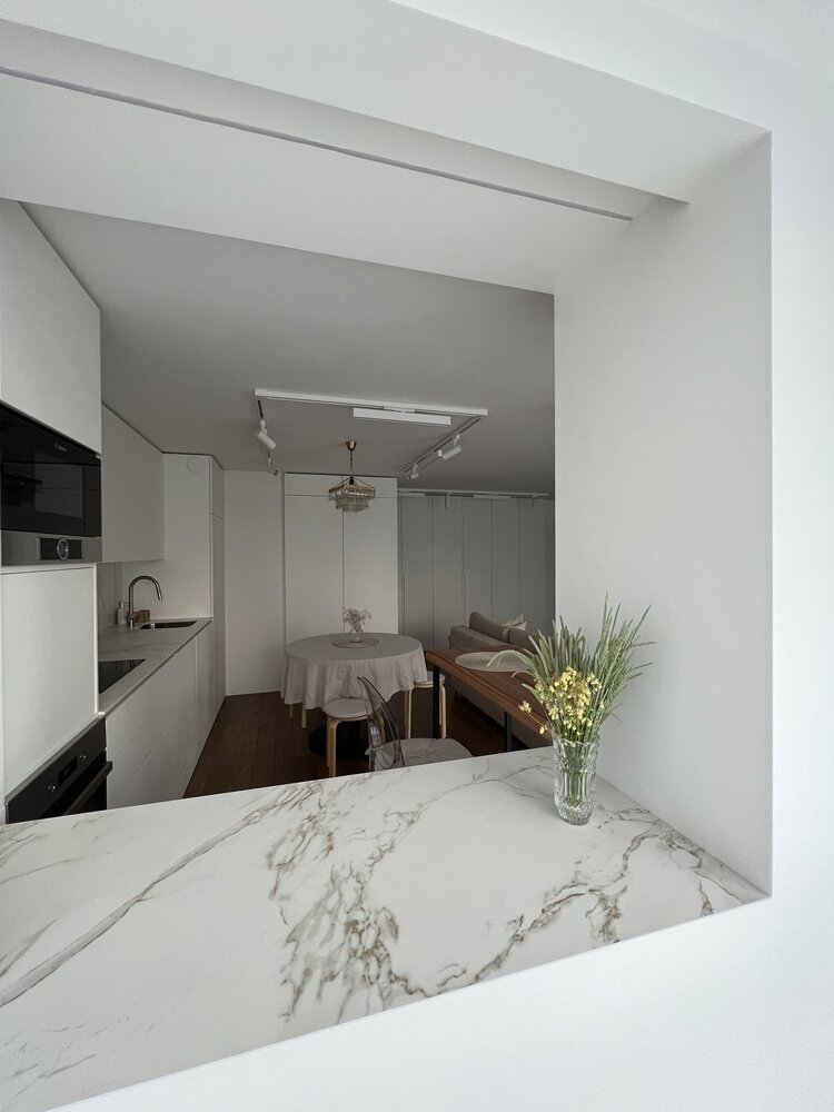 Раньше на кухне было обычное окно — полностью его убрали, сделали подсветку, а вместо подоконника сделали рабочую столешницу из керамики.