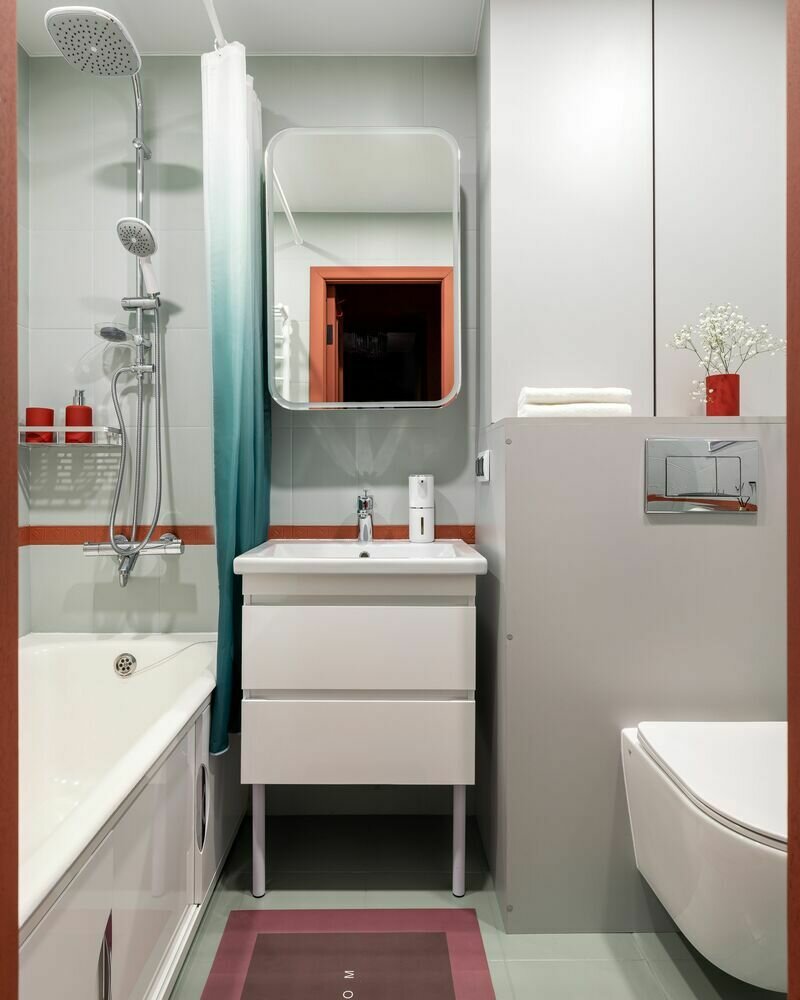 Счетчики, смесители и запорную арматуру заменили, установили гребенки на горячую и холодную воду. В ванной предусмотрели смеситель с терморегулятором.