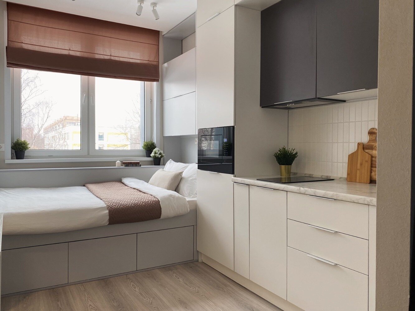 Фотография: Кухня и столовая в стиле Современный, Минимализм, Малогабаритная квартира, Квартира, Студия, Проект дня, Москва, Монолитный дом, до 40 метров, Юлия Колесниченко, Надежда Воин – фото на INMYROOM