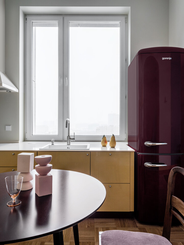 Вся кухня выполнена на заказ по эскизам дизайнера. Из бытовой техники на кухне есть варочная поверхность, вытяжка, духовой шкаф и посудомоечная машина. Плюс отдельностоящий холодильник. Под хранение используются винтажная консоль и антресоль над ней.