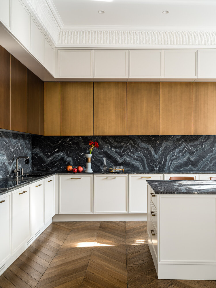 В кухне есть все необходимое: встроенные холодильник, варочная поверхность, духовой шкаф, СВЧ, вытяжка, посудомоечная машина, винный шкаф. Кухню изготовили из МДФ, частично выкрасили фасады эмалью в цвет стен и сделали акцент в виде второй линии фасадов, патинированных под бронзу. Фартук и столешница из матового итальянского гранита с необычной фактурой. Чтобы получить такое красивое перетекание рисунка на камне, пришлось рассмотреть не один вариант раскроя слэбов.