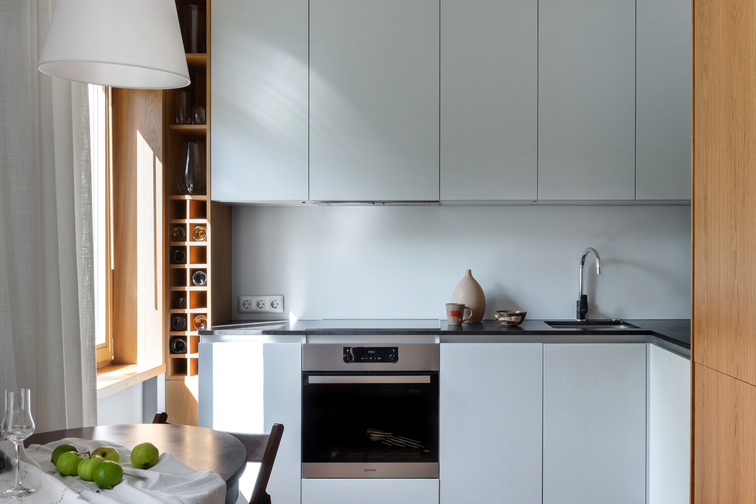 Фотография: Кухня и столовая в стиле Скандинавский, Современный, Минимализм, Малогабаритная квартира, Квартира, Проект недели, Москва, Блочный дом, 2 комнаты, до 40 метров, Наталия Ленда – фото на INMYROOM